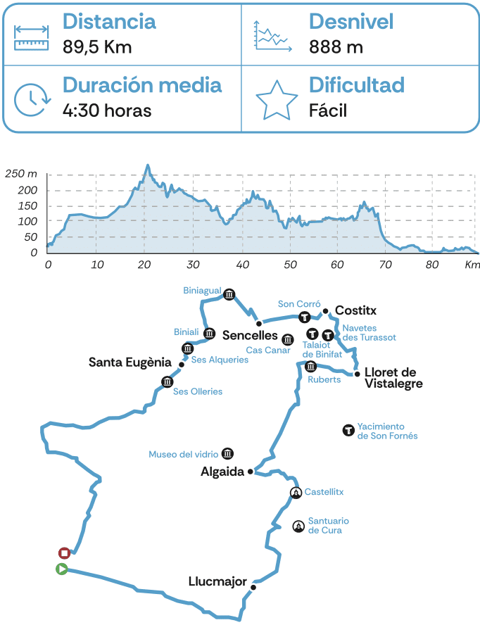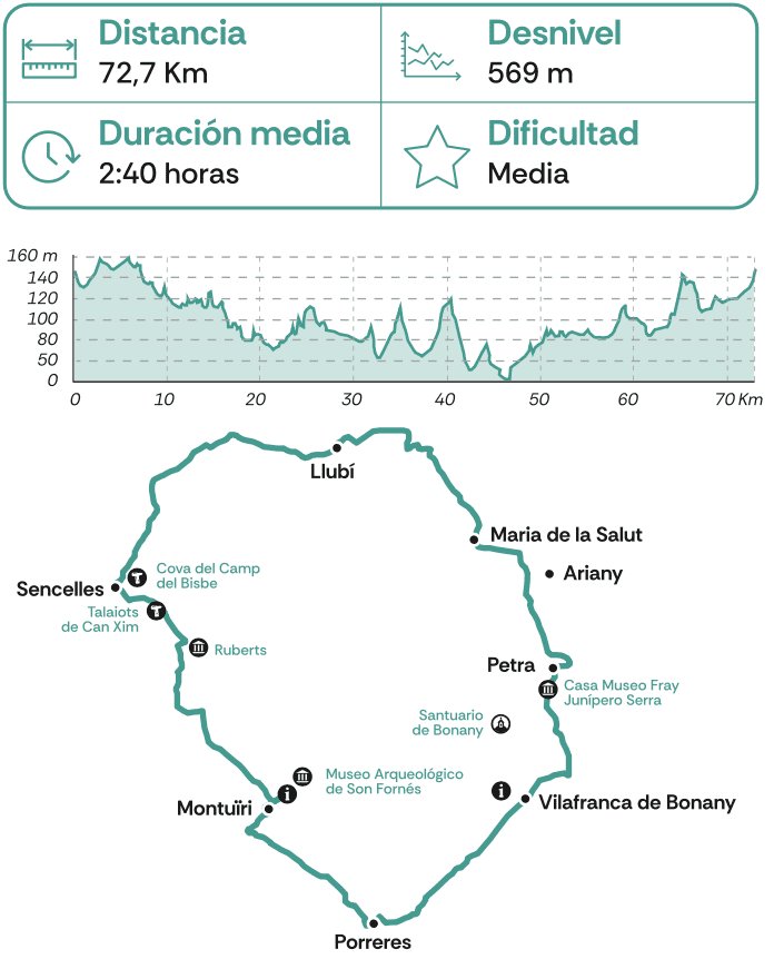 Ruta de dificultad media que precisa de una buena forma física ya que transcurre por algunos tramos sin asfaltar. En el recorrido se pueden visitar varios molinos de viento, típicos del paisaje del Pla. A su vez, también se puede disfrutar de varios puntos que componen la ruta talaiótica entre Costitx y Sencelles como el talaiot de Binifat.