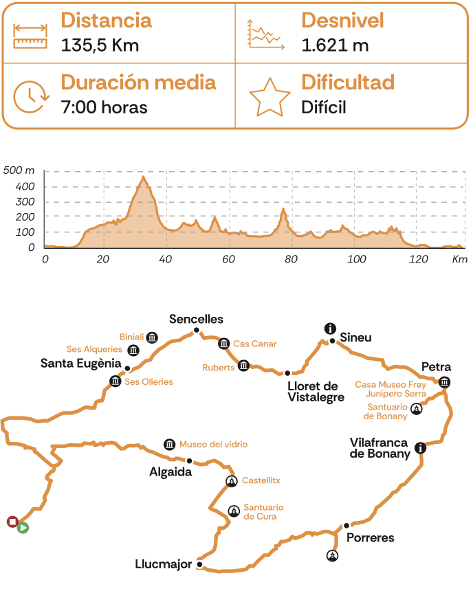 Esta ruta es un agradable recorrido por el campo mallorquín. Comenzando por el pueblo de Sencelles, el recorrido circula por carreteras tranquilas rodeadas de exuberantes paisajes. El trayecto brinda la oportunidad de explorar la autenticidad de la región, disfrutando de la serenidad del entorno natural. Llegando a Santa Eugènia, se puede apreciar la arquitectura tradicional mallorquina. Se trata de una ruta perfecta para ciclistas de diferentes niveles, ya que ofrece un terreno mayormente llano con unas colinas muy suaves.