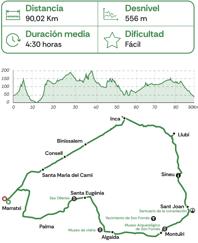 Ruta de carácter circular que tiene como punto de partida y final el Pont d’Inca con el objetivo de recorrer gran parte del Pla. Es el itinerario ideal para aquellos usuarios que quieren llevar a cabo distancias largas por carreteras secundarias en buen estado y con una fácil convivencia con otros vehículos. Ofrece unos paisajes magníficos y da la posibilidad de hacer parada en varios museos como Son Fornés o el museo del Vidrio de Can Guardiola, declarado patrimonio cultural inmaterial de la humanidad.