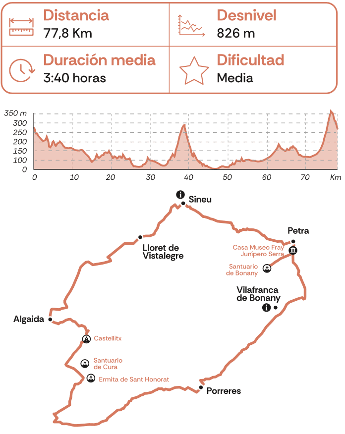 Permite visitar seis ermitas u oratorios, localizadas en las pequeñas elevaciones del Pla, ofreciendo unas vistas panorámicas maravillosas de gran parte de la isla. En el Puig de Cura, se pueden visitar los santuarios de Gràcia, Sant Honorat y Cura, a los que se llega por una carretera de 4,5 km y un 5% de pendiente media. El circuito de ascensos se completa con Monti-sion en Porreres (1,4 km y 7% de pendiente) y Bonany (3,7 km y 5%) en Petra. A la vuelta se pasa por Sineu, famoso por su mercado.